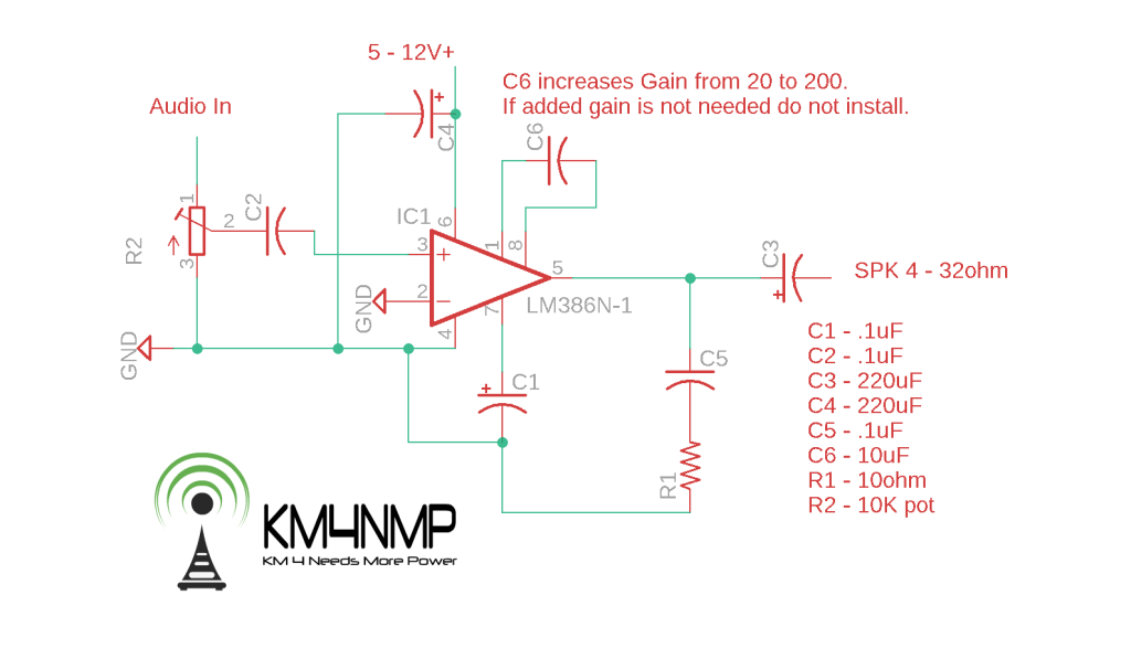 Our project this week will be the LM386 Audio Amplifier. This is a very versatile IC and will be used in later projects. These chips are capable of operating with 5 -12vdc. They can drive a 4 – 32 ohm 1 watt speaker. Some of the capacitor values are changed to be more common to what I have in my shop. This setup has been very stable for my projects. Review the manufacture cut sheet for several example applications and circuits.