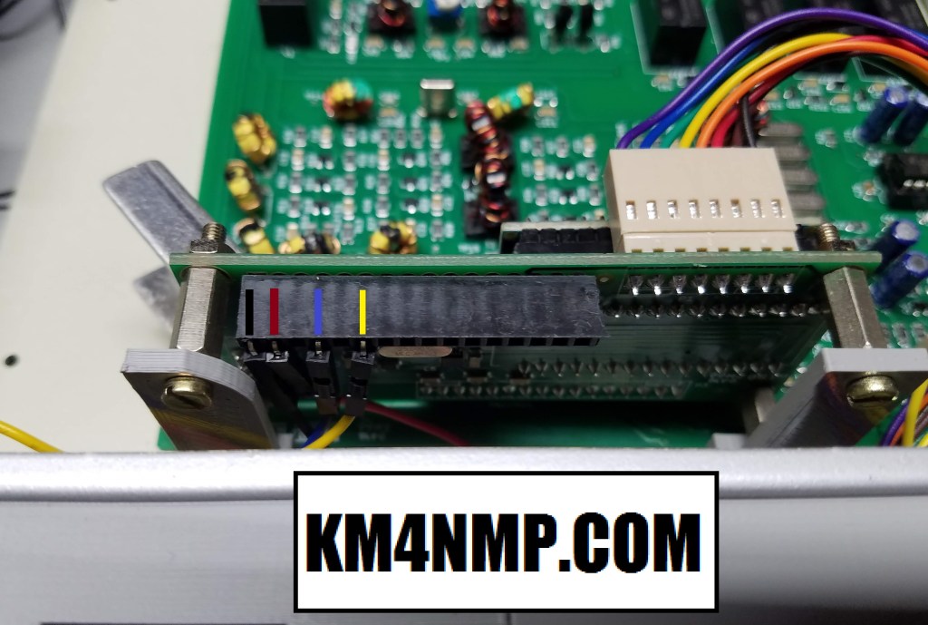 To connect the Nextion Touch screen, remove the original LCD screen. The new screen will use 4 of the pins from the old screens port. The picture above shows what pin each wire from the Nextion needs to be terminated to. Below is a picture of the LCD port with the Nextion connected. To make it easier to see, a colored stripe was drawn above each connection.