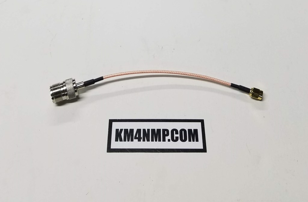 A SMA Male to SO-239 Female adapter is used to make the connection to standard 50 Ohm coax. SO-239 and PL-259 are more commonly used on antennas and easier to terminate.