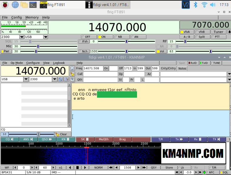 While setting up the rig control, Fldigi started decoding transmissions. The call sign of the the operator is blocked out in green.