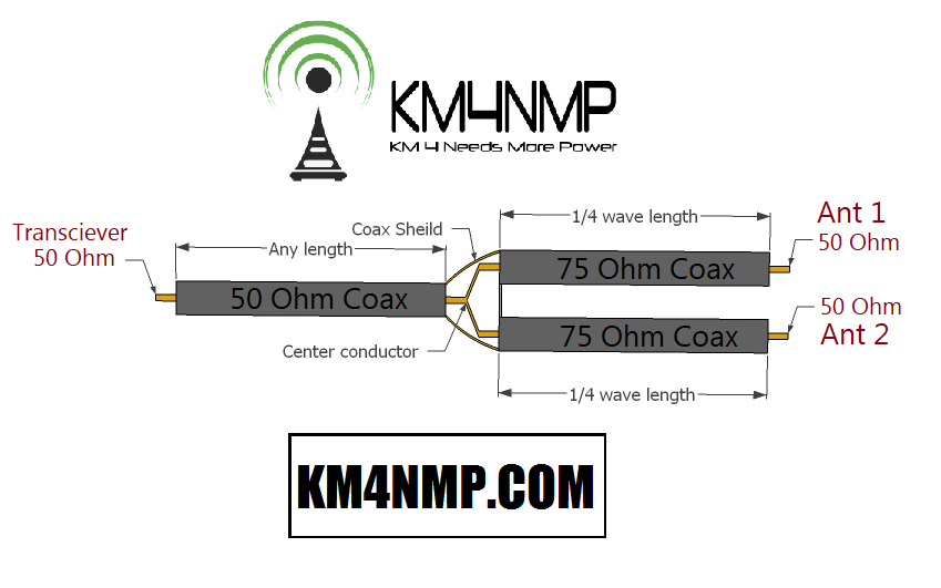 A matching section has to be constructed to match the 50 Ohm feed line. Feeding each yagi with a 1/4 wave piece of 75 Ohm Coax brings their impedance up to 100 Ohms. When connected together this brings the impedance down to 50 Ohms a perfect match for standard feed line.