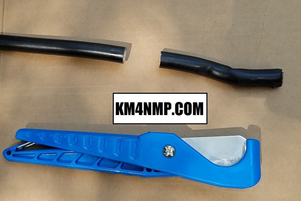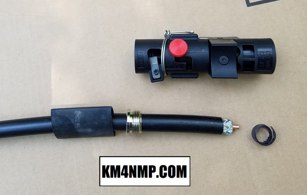 Before the antenna is mounted, the antenna side of the feed line is prepped for a connector. First the cable needs a good flush cut.