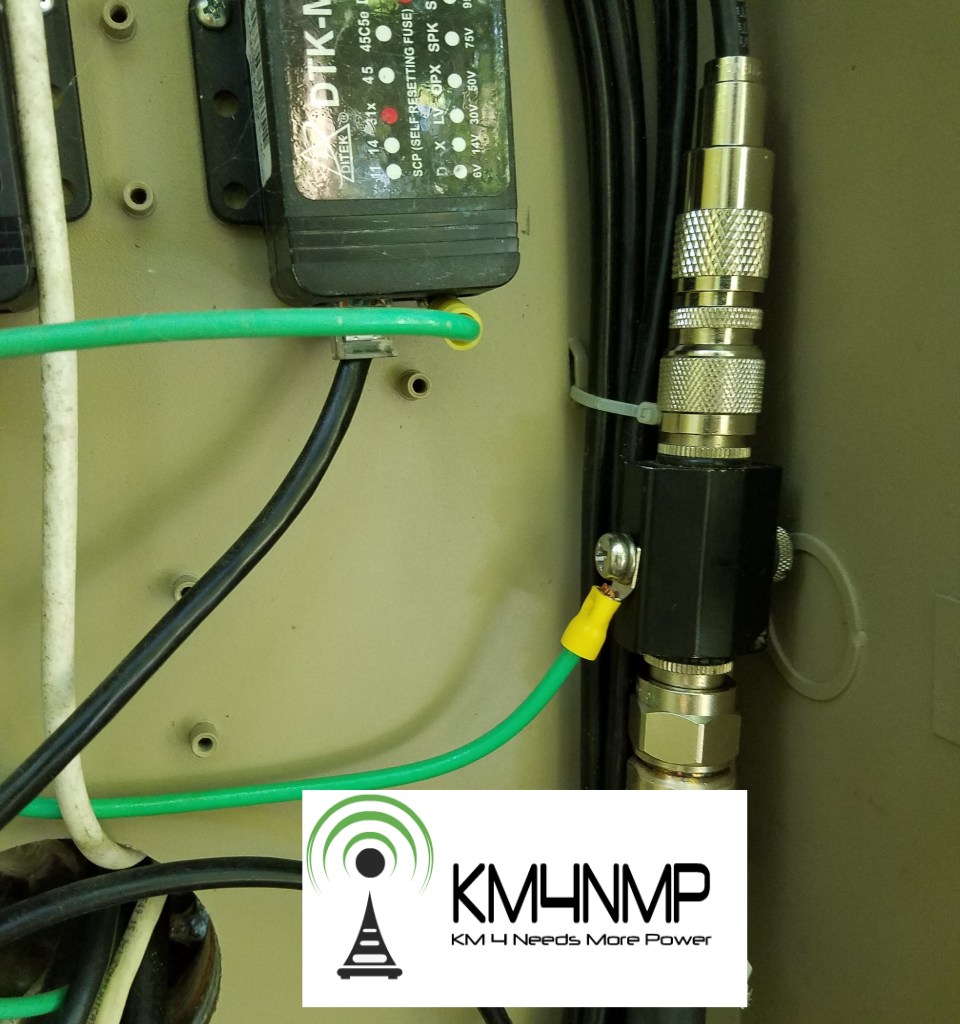 Now the feed line is ready we can move on to the antenna. Since the antenna was assembled and tuned in our last post, the antenna was just removed from the test stand and mounted to the mast. The feed line connection at the base of the antenna was taped several layers of high quality electric tape and rubberized tape. Unfortunately I was not able to take pictures of weatherizing the connection. It was done 15 feet on top of a ladder and difficult enough without taking pictures.